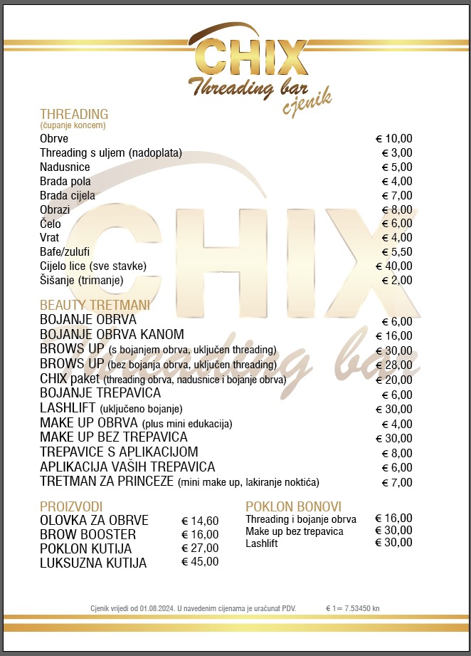 Cjenik vrijedi od 01.08.2024. Sve cijene su izražene u eurima i kunama. U navedenim cijenama je uračunat PDV.